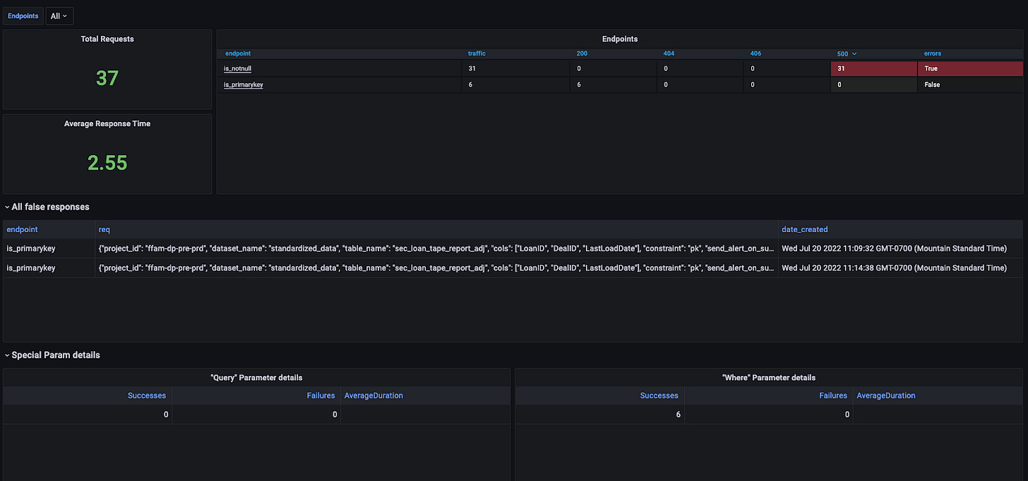 For getting a more high-level view, it’s important to have alerting and monitoring set up at the API layer to ensure the health and stability of the microservice by checking response times, volume, error code, etc., as should be done for any production microservice. However, it’s also beneficial to have a view into the results of the quality checks themselves. Being able to see how many failures there are, what type of checks are failing, and receiving alerts when the failures become abnormally high are all ways for you to get a high-level picture of the data warehouse’s quality.