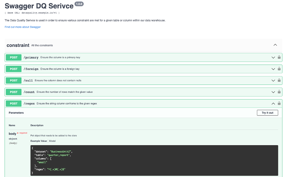 With these requirements, we wanted to create a service with an endpoint for each quality check – one for primary keys, one for nulls, one for duplicates, etc. By doing this, it would be simple to continuously add new endpoints without affecting any existing endpoints. In addition, using a REST API would provide the flexibility to integrate with just about any modern ETL tool.