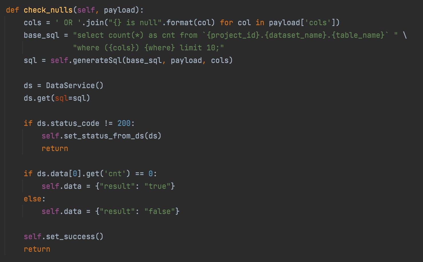 Another decision that was made regarding the API was how the service would check data. You could make an argument saying that the data could be passed into the API to be checked, and so the data location would not matter. However, for our purposes, given the vast size of the data, as well as the fact that all our data sits inside the same data warehouse, the best option was to pass the data’s table location as parameters. Then, the API would be able to create a connection to the data warehouse and perform the checks using that infrastructure. This allows for very low latency requests being sent to and from the service.